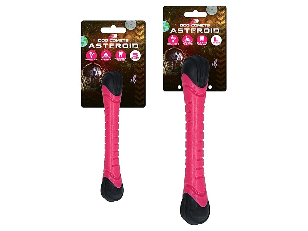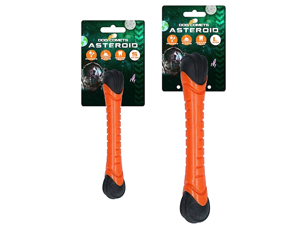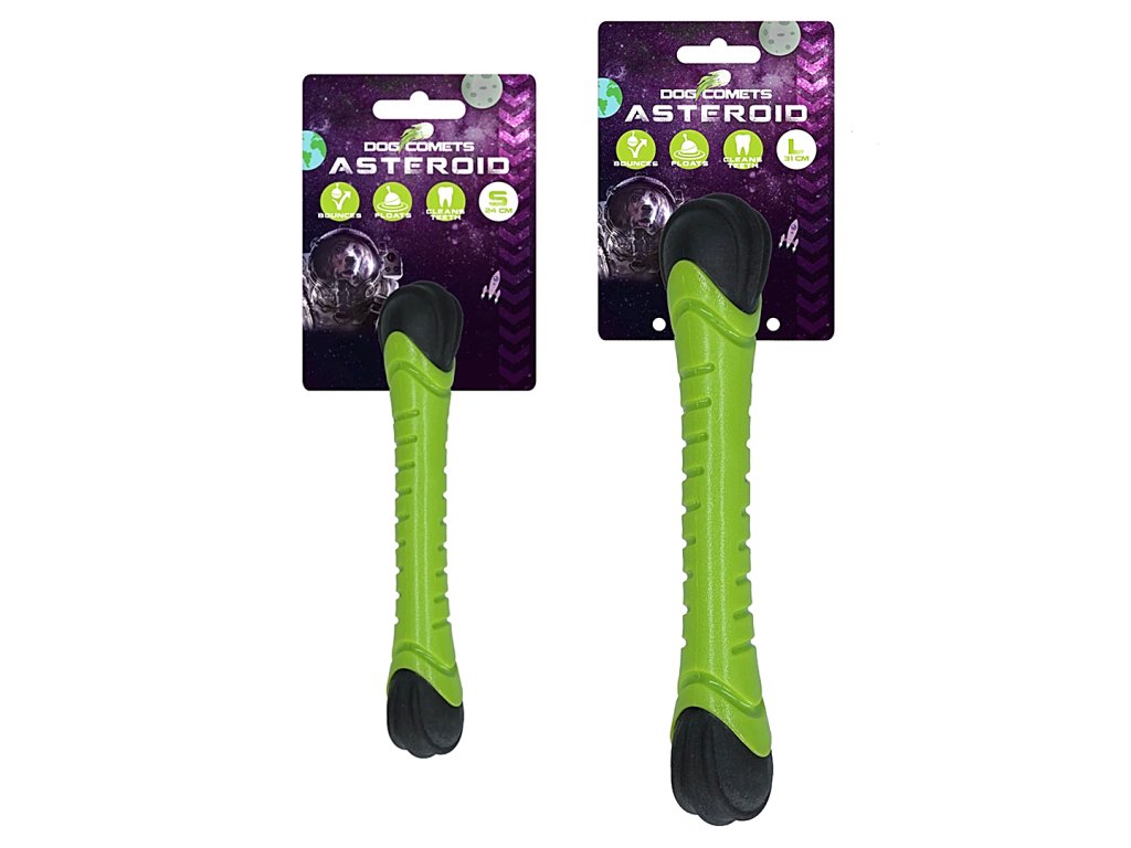 Aportovací tyč Asteroid z kolekce firmy Dog Comets je vyrobena z odolné gumy, která je zároveň pružná a plovoucí. Při dopadu na zem se díky pryžovému zakončení odrazí a na poslední chvíli může změnit směr. Střed tyče zároveň píská, což zvyšuje radost psů ze hry.
