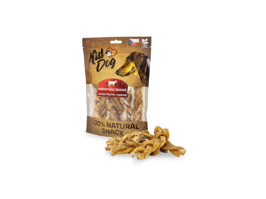 KIDDOG NATURAL SNACK je vysoce kvalitní pamlsek, 100% přírodní produkt šetrně sušený teplým vzduchem. Neobsahuje žádné konzervanty a barviva. Pomáhá při čištění zubů od zubního plaku. Posiluje žvýkací svaly. Je velmi odolný a bohatý na přírodní kolagen. Vhodný pro střední a velká plemena.