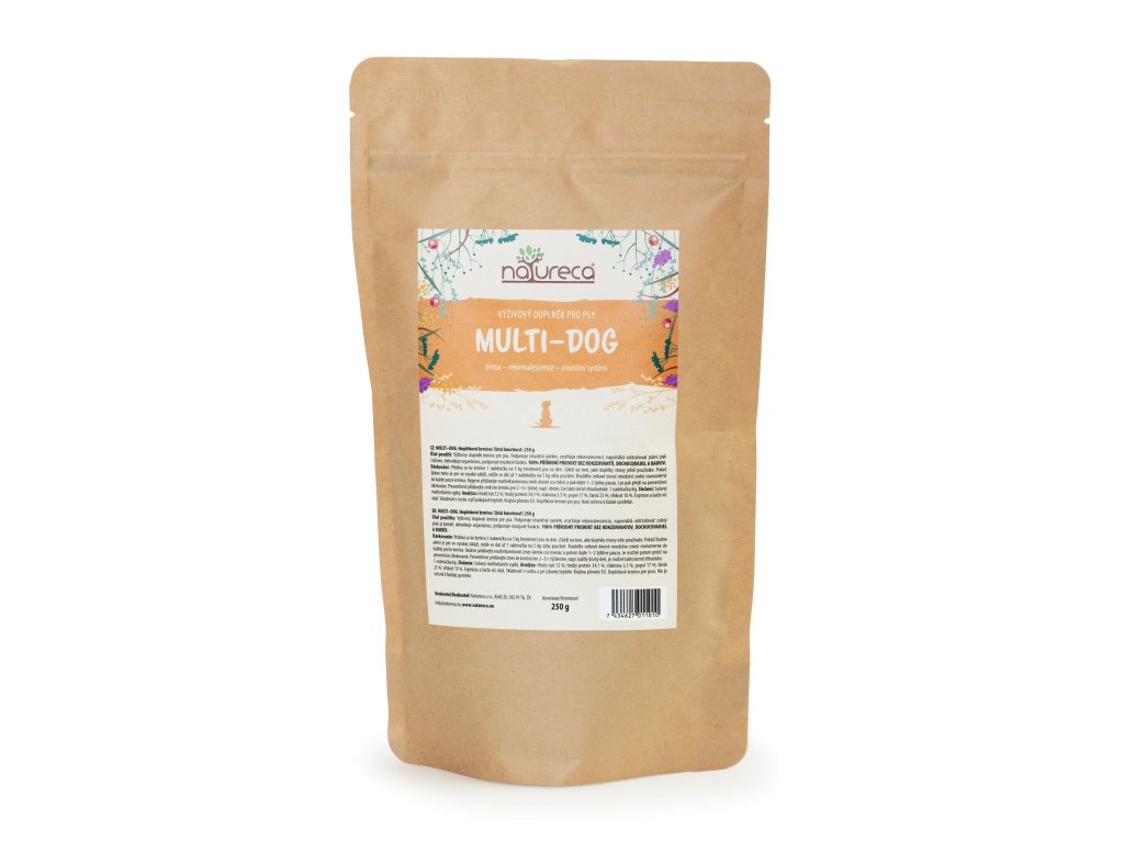 Dávkování: Přidává se ke krmivu 1 odměrka (6 g - je součástí balení) na každých 5 kg hmotnosti psa na den.   Nepoužíváte-li zádné jiné doplňky stravy nebo je pes ve vysoké zátěži, můžete dát až 1 odměrka / 5 kg váhy psa / den. Rozdělte celkové denní množství směsi rovnoměrně do každé porce krmiva. V akutních případech přidávejte multivitamínovou směs denně cca měsíc a pak dejte 1–⁠2 týdny pauzu. Poté lze přejít na preventivní dávkování. Preventivně přidávejte směs ke krmivu jen 2–⁠3x týdně, např. obden, takto lze krmit dlouhodobě.